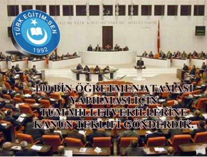 Türk Eğitim-Sen, TBMM Genel Kurulu’nda görüşülen Torba Kanun Tasarısı’nda 35 bin olarak öngörülen öğretmen atama sayısının 100 bine çıkarılması konusunda kanun teklifi hazırlayarak, TBMM’ye sunmaları için tüm milletvekillerine gönderdi.