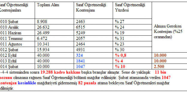 Mağduriyetimiz 2012 Ağustos öğretmen atamasında 324 kişi alınarak başlamış ve halen devam etmektedir. Şu anda atama bekleyen Sınıf Öğretmeni sayısı 26 bin olmakla birlikte her sene 11 bin civarında Sınıf Öğretmeni mezun olmaktadır. Biz bu bölümü kazanırken yüksek puanlarla kazandık. Türkiye’nin her yerinde öğretmenlik yapacağımızı düşünerek tercih yaptık ama her sene 7-10 bin arası öğretmen alımı olan Sınıf Öğretmenliği bölümü 4-4-4 sisteminin en mağdur branşı oldu. Alımları bitmez gözüyle bakılan Sınıf Öğretmenliği bölümünün bir gecede 29 bin norm fazlası öğretmeni olmuştur.