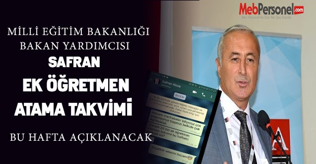 Bu bilgiyi Milli Eğitim Bakanlığı Bakan Yardımcısı Sn Mustafa Safran whatsApp üzerinden cevapladı. Kendisine ek atama takvimini soran öğretmen adayına Mustafa Safran ek atama takviminin bu hafta açıklanacağını belirtti.