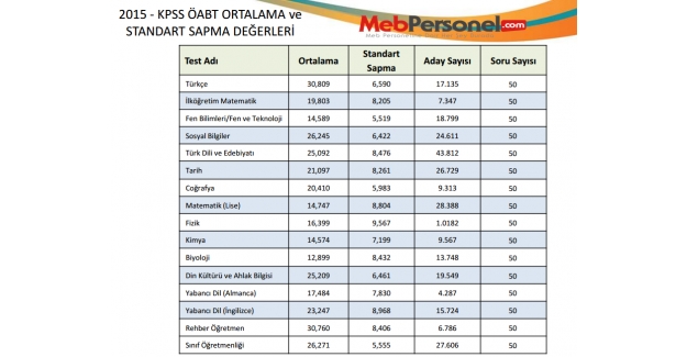 2015 ÖABT Standart Sapma ve Ortalama Değerleri ÖSYM tarafından açıklandı. İşte o tablo: