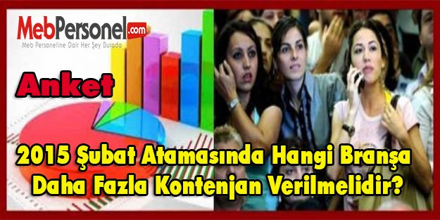 24 Kasım öğretmenler gününde Başbakan Ahmet DAVUTOĞLU 15 bin öğretmen ataması yapılacağı müjdesi verdi.. 2015 Şubat Atamasında Hangi Branşa Daha Fazla Kontenjan Verilmelidir? Bu kapsamda mebpersonel.net olarak sizler için önemi oldukça büyük olan bir anket hazırladık. Bu ankete göre yaklaşan 15 bin atamada sizce en çok atama hangi branştan olmalı diye sizlere soruyoruz. Sizlerde bu ankete katılarak hangi branşdan atamanın en çok yapılmasını istiyorsanız o branşa oy vererek anketi destekleyebilirsiniz.