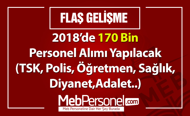 Başbakan Binali Yıldırım, Milli Savunma Bakanlığı ve Polis Akademisi Başkanı Yılmaz Çolak’ın açıklamalarına göre 2018 yılında toplam 170 bin memur, asker ve polis alımı gerçekleştirilecek.