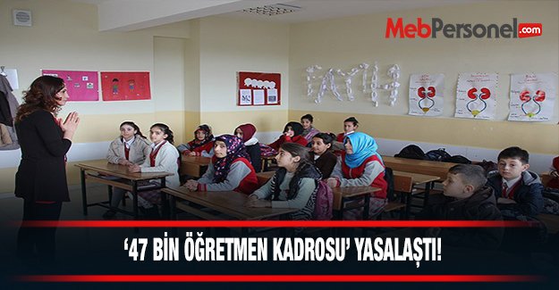 Kanunla, Milli Eğitim Bakanlığına 47 bin öğretmen kadrosu ihdas ediliyor. Öğretmen unvanlı kadrolardan 35 bin adedi ile Bakanlığa ait diğer hizmet sınıfları kadrolarından 2 bin 320 adedine, Genel Kadro ve Usulü Hakkında Kanun Hükmünde Kararname ve 2015 yılı Merkezi Yönetim Bütçe Kanunu kapsamında yapılan atamaların dışında 31 Aralık 2015’e kadar atama yapılacak.