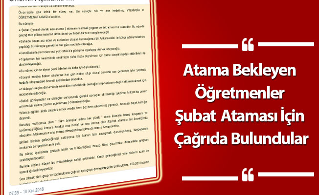 Atama Bekleyen Öğretmenler Şubatta Öğretmen Ataması İçin Çağrıda Bulundular. Atama Bekleyen Öğretmenler Şubatta Yeni Atama Talep Ediyor. Şubat ataması öğretmenlerden önemli açıklama. Sosyal medyada facebook grubu Öğretmen Atamaları Platformu Şubatta yeni bir öğretmen ataması için açıklama yayınladı. Sitemize ulaşan atama bekleyen öğretmenlerin açıklaması şu şekilde: