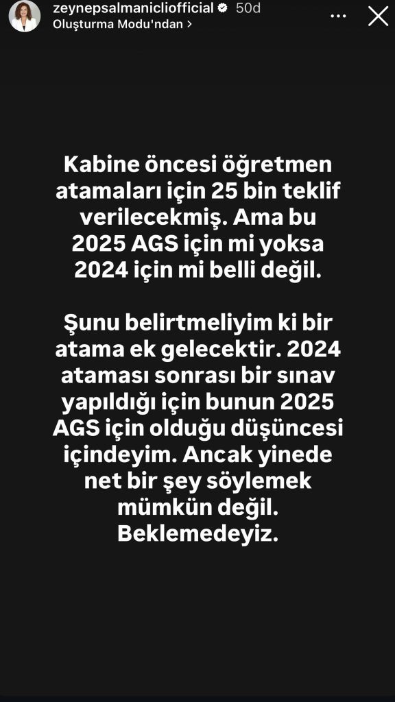 "Kabine öncesi öğretmen atamaları için 25 bin teklif verilecekmiş. Ama bu 2025 AGS (Akademi Giriş Sınavı) için mi yoksa 2024 için mi belli değil."