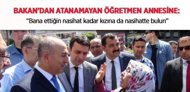 Devletin her yıl 50 bin yeni kadro açtığına dikkat çeken Bakan Çavuşoğlu da, “Bana ettiğin nasihat kadar kızına da nasihatte bulun ki biraz fazla çalışıp yüksek puan alsın. Sizin taleplerinizi değerlendireceğiz. AK Parti hükümeti olarak gençlerimizin önünü açmak için elimizden gelen gayreti gösteriyoruz” diye konuştu.