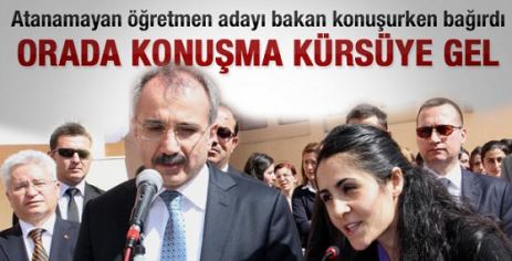 Burada bir konuşma yapan Bakan Dinçer, Milli Eğitim’de yaptıklarını anlatmaya başladı. Tayinlerle ilgili konuşurken protokolun hemen arkasında oturan öğretmen adayı 24 yaşındaki Ayşegül Namlıgezoğlu ayağa kalkarak Bakan Dinçer’e, “Sayın bakanım. Sayın Bakanım” dedikten sonra şöyle konuştu: