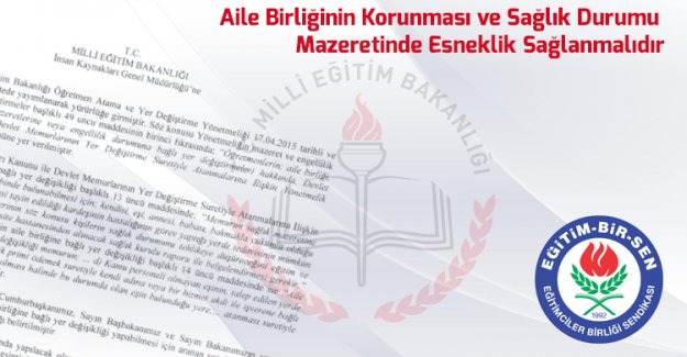 Eğitim-Bir-Sen, Milli Eğitim Bakanlığına başvurarak Ağustos ayında yapılacak olan öğretmenlerin özür durumuna bağlı yer değişikliklerinde, aile birliği mazeretinde aranan son üç yıl kesintisiz sigorta ödeme şartının aranmayarak, daha önce uygulanan ve genel kabul görmüş olan son iki yıllık süre zarfında en az 360 gün sigortalı hizmeti olma şartının yeterli görülmesini talep etti.