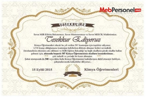 37 000 Öğretmen atamasında 587 kadro alan kimya öğretmenleri hazırladıkları bir belge ile MEB’e teşekkürlerini ilettiler. MEb Müsteşarı Yusuf Tekin bu teşekküre kayıtsız kalmayarak Kimya Öğretmenlerinin hazırladığı belgeyi twitter hesabından paylaşarak “Bize teşekkür eden Kimya öğretmenlerimize biz de teşekkür ediyoruz. ” diye karşılık verdi