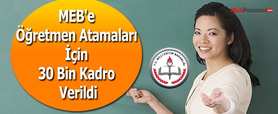 MEB’e Öğretmen Atamaları İçin 30 Bin Kadro Verildi. Şubat ayında 30 Bin Öğretmen Atamaları yapılacak. Öğretmen atamaları için MEB’e tahsis edilmek üzere 30 Bin atama ayrıldı. Öğretmen atamaları için MEB Şubat ayında başvuruları almaya başlayacak. 30 Bin Şubat ayı Öğretmen atamaları 109 branşta ilgili alandaki öğretmen ihtiyaçlarına göre branşlara oransal olarak dağıtılacak. ( 30 Bin Öğretmen atamaları, Şubat Öğretmen atamaları, MEB 2016 yılı Öğretmen atamaları)