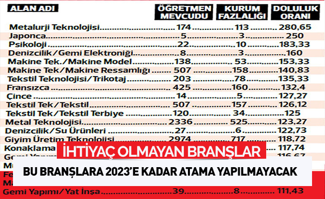 MİLLİ Eğitim Bakanlığı (MEB) şu anda 20 farklı alanda öğretmen almayı planlamıyor. Çünkü bu 20 alanda doluluk oranı, bazılarında yüzde 280’lere ulaşmış durumda. Alan öğretmenliğinde en büyük fazlalık felsefe grubunda görülüyor. Bu alanda 1594 öğretmen şimdiden ihtiyaç fazlası duruma düşmüş bile. Bunu Giyim Üretim Teknoloji öğretmenleri takip ediyor. Bu alanda da 717 öğretmen fazlası var. Yine Metal Teknolojisi’nde 525, Konaklama ve Seyahat Hizmetleri alanında ise 199 ihtiyaç dışında çalışan öğretmen olduğu görülüyor.