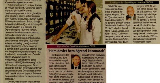 Türk Eğitim-Sen’in yorumu: Habertürk Gazetesinde hem sendikamızın hem de Eğitim-Bir-Sen’in konuyla ilgili görüşleri bu şekilde yer almıştır. Devlet okullarının bu kadar çok ihtiyacı varken, 350 bin öğretmen atama beklerken, öğretmenlerin ek ödemeleri beş kuruş artırılmamışken; bir sendikanın devletin özel okullara öğrenci başına 1500 TL teşvik vermesini desteklemesini kamuoyunun takdirine bırakıyoruz.