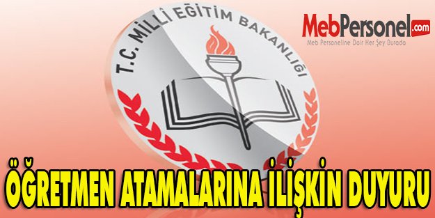 Milli Eğitim Bakanlığı İnsan Kaynakları Genel Müdürlüğü tarafından engelli öğretmen atamaları konusunda bir duyuru yayınlandı. Bu duyuruyu okumak için aşağıdaki bağlantıyı tıklayabilirsiniz.