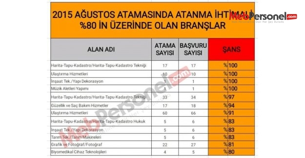 2015 öğretmen atamaları yapıldı. Atamalar sonar atanma ihtimali %80 ve üzeri olan branşları Mebpersonel.com olarak sizlerle paylaşıyoruz: