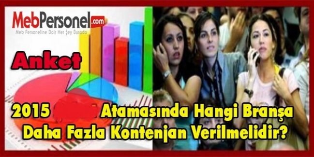 2015 Ağustos Öğretmen Atamasında Hangi Branşa Daha Fazla Kontenjan Verilmelidir? Bu kapsamda mebpersonel.net olarak sizler için önemi oldukça büyük olan bir anket hazırladık. Bu ankete göre yaklaşan 37 bin atamada sizce en çok atama hangi branştan olmalı diye sizlere soruyoruz. Sizlerde bu ankete katılarak hangi branşdan atamanın en çok yapılmasını istiyorsanız o branşa oy vererek anketi destekleyebilirsiniz.