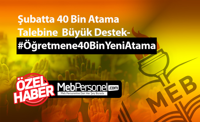 Şubatta 40 Bin Atama Talebine Büyük Destek-#Öğretmene40BinYeniAtama. Şubat ayında 40 bin öğretmen ataması için Bakan Ziya Selçuk’tan müjdeli haber bekleyen öğretmen adaylarının bugün sosyal medyada başlattığı etikete rekor sayıda paylaşım yapıldı. #Öğretmene40BinYeniAtama hashtagi kısa sürede trend topic olarak ses getirdi. Etikete sanat dünyasından, basın mensuplarına ve siyasilere kadar büyük destek geldi.