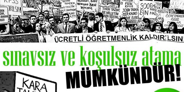 ÖĞRETMENLERİN ÜSTÜNDEN ARTIK KİMSE SİYASET YAPMASIN!BİZLER BU OKULLARI YILLARCA DİRSEK ÇÜRÜTEREK OKUMUŞ VE KENDİ KENDİNE YETEBİLEN GERÇEKLERİ SEÇEBİLEN BİR KİMLİĞE SAHİBİZ!SON ZAMANLARDA AYÖP ÜN HAREKETE GEÇMESİ BİRİLERİNİ RAHATSIZ ETMEYE BAŞLADI! KİMSE BİZİ BU HAKLI YOLDA KARALAYARAK LEKELEYEREK VAZGEÇİRECEĞİNİ AKLINDAN GEÇİRMESİN!! YA ÜCRETLİ KALKACAK YA ÖĞRETMENLER ATANACAK! BİZ ÖĞRETMENİZ YALVARMAYIZ SADECE ÖĞRETİRİZ!”YA HEPİMİZ YA DA HİÇBİRİMİZ” ÜCRETLİ SON BULACAK HERKES GÜVENCELİ ATANACAK!!”ATAMA HAKTIR SUSMA HAYKIR”