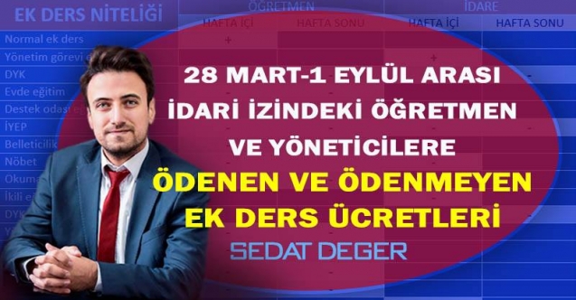 Bilindiği üzere normal şartalar altında idari izin süresince toplu sözleşme maddesi uyarınca bazı ek dersler ödenmesi mümkün idi fakat dünyanın ve ülkemizin içinden geçtiği olağandışı süreçten (koranavirüs salgını) nedeniyle Milli Eğitim Bakanlığımız bugün itibariyle tüm valiliklere göndermiş olduğu resmi yazı ile normal müfredat kapsamında okutulan ek dersler dışında verilen tüm ek dersleri iptal etti./ Sedat DEGER Eğitimci Yazar