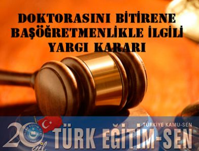 Türk Eğitim-Sen üyesi adına açılan davada, Kastamonu İdare Mahkemesinin 2012/805 E., 2012/965 K. Sayılı ve 27.12.2012 tarihli kararı ile; tezli doktora öğrenimini tamamlayan davacının başöğretmen unvanını alabilmek için yaptığı başvurunun reddine ilişkin işlemin iptali ile mali ve özlük haklarının idareye başvuru tarihinden itibaren yasal faizi ile birlikte tahsiline karar verilmiştir.