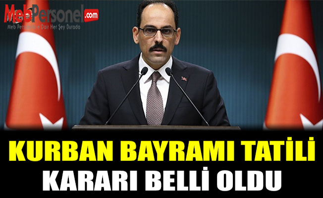 Cumhurbaşkanlığı Sözcüsü İbrahim Kalın, “Kurban bayramı yaklaşıyor. Kabinemizin aldığı kararı da sizlerle paylaşmak istiyorum. Kurban bayramı 9 güne çıkartılmıştır. Yani arefe günü Pazar günü tatile dahil edilmiş bulunuyor. Toplamda 9 gün olacaktır.” dedi.
