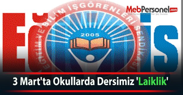 Bu amaçla, AKP iktidarının bilimsel, laik, ulusal ve demokratik eğitimi tasfiye etme girişimlerine karşı başta Eğitim-İş üyesi öğretmenler olmak üzere tüm öğretmenler; 3 Devrim Yasası’nın kabulünün 91. Yıldönümü olan 3 Mart 2015 tarihinde, yakalarına “Laiklik Özgürlüktür” sloganının bulunduğu kokartları takacak, Eğitim-İş tarafından hazırlanan ders planı dahilinde ülke genelinde tüm okullarda ilk ders saatinde “Laiklik” konusunu anlatacaklardır.