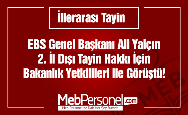 Memur Sen ve Eğitimciler Birliği Sendikası(EBS) Genel Başkanı Ali Yalçın, Milli Eğitim Bakanlığı yetkilileri ile öğretmenlere isteğe bağlı ikinci illerarası tayin hakkı verilmesi konusunda görüşme gerçekleştirdi. Bilindiği üzere son MEB müsteşarı Yusuf Tekin, konu ile ilgili çalışma yapılabileceğini ifade etmişti.