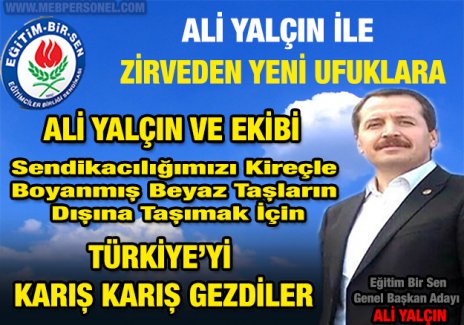 Eğitim Bir Sen Genel 5. Olağan Genel kurulun sayılı günler kaldı. 10 Ocak 2015 tarihinde “Zirveden Yeni Ufuklara “sloganıyla Eğitim Bir Sen Genel Başkan Adaylığını açıklayan Ali YALÇIN ve ekibi “Sendikacılığı Kireçle Boyanmış Beyaz Taşların Dışına Taşımak İçin” Türkiye’yi karış karış gezdiler.