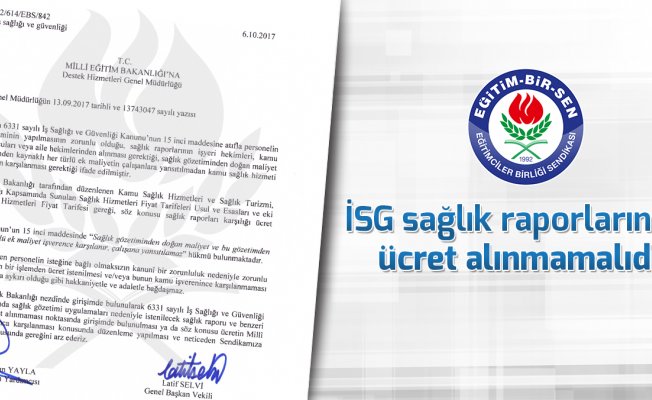Eğitim-Bir-Sen olarak, Millî Eğitim Bakanlığı’ndan, Sağlık Bakanlığı nezdinde girişimde bulunularak 6331 sayılı İş Sağlığı ve Güvenliği Kanunu kapsamında sağlık gözetimi uygulamaları nedeniyle istenilecek sağlık raporu ve benzeri hizmetlerden ücret alınmamasını ya da söz konusu ücretin Millî Eğitim Bakanlığı’nca karşılanması konusunda düzenleme yapılmasını istedik.