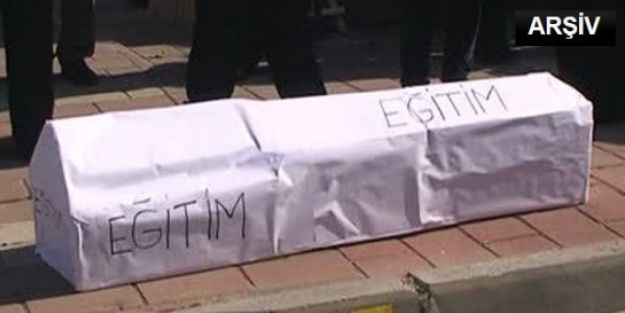 Yönetici atamalarında sınav sonuçları ve liyakatin dikkate alınmasını isteyen göstericiler, üzerinde ‘adalet’ yazılı tabut taşıdı.
