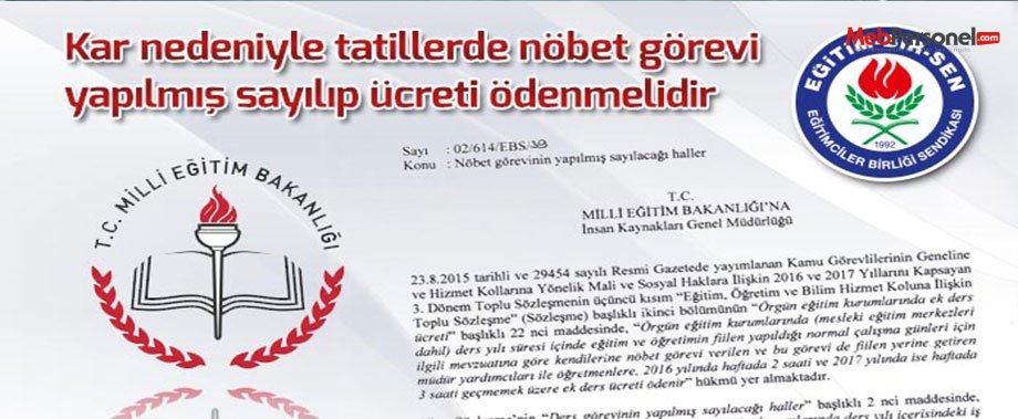 Kar yağışından kaynaklanan olumsuz hava şartları gibi sebeplerle eğitim kurumlarının tatil edildiği il ve ilçelerde görevli yönetici ve öğretmenlerin, toplu sözleşme hükmüne istinaden, bu sürelerde üzerlerinde bulunan aylık karşılığı ders, varsa ek ders, ders niteliğinde yönetim, hazırlık ve planlama görevlerini ve bu kapsamda üzerlerinde bulunan nöbet görevlerini yapmış sayılmaları gerektiğini dile getirilerek, bu görevleri için nöbet ücretinin ödenmesini istedik.