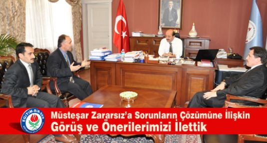 Genel Sekreterimiz Ahmet özer, Genel Basın Yayın Sekreterimiz Ali Yalçın ve Genel Mevzuat ve Toplu Sözleşme Sekreterimiz Ramazan Çakırcı ile birlikte Milli Eğitim Bakanlığı Müsteşarı Emin Zararsız ile görüşerek, eğitim çalışanlarının sorunlarını ve bunlara ilişkin görüş ve çözüm önerilerimizi iletti. Burada konuşan Ahmet Özer, “Sorunların bilinirliğinin ve farkındalığının sağlanmasına yönelik görüş ve önerilerimizin dikkate alınarak, bunlara çözüm getirilmesi yönünde çalışmaların yürütüldüğüne ilişkin inancımız bakidir” dedi.
