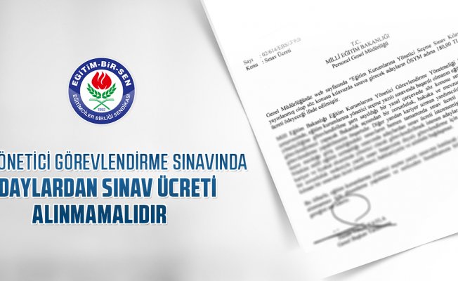 Bu nedenle, Bakanlığa yazılı müracaatta bulunarak, eğitim kurumlarına yönetici görevlendirme yazılı sınavına katılacak adaylardan sınav ücreti alınmaması için düzenleme yapılmasını talep ettik.