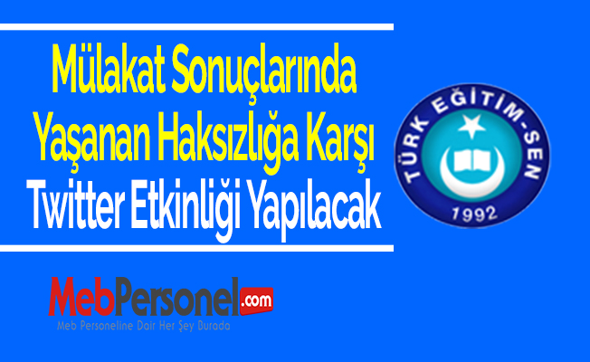 Türk Eğitim-Sen olarak, mülakat haksızlığına karşı bu akşam saat 21:00’de Twitter’da bir hashtag çalışması yapılacaktır.