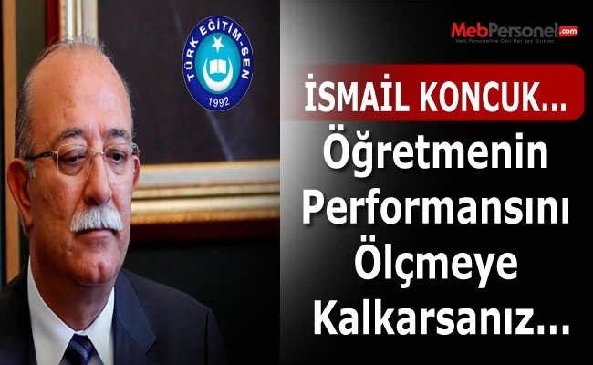 İsmail Koncuk, MEB Bakanı İsmet Yılmaz’a, ”yapma Sn Yılmaz, mülakattan sonra öğretmene performans hatasına da düşme.” diye karşılık verdi. Başarının, bölge imkanları, aile ve öğrenci gibi kriterlere göre olduğundan bahseden İsmail Koncuk, bu nedenle her bölge, her il, her ilçe ve hatta her okulun sosyo ekonomik seviyesine göre performans kriterleri belirlemenin mümkün olmayacağını ifade etti. Yeni bir şey yapmayım anlayışının çok daha gerilere götüreceğinden dem vuran İsmail Koncuk, önemli olanın kalıcı ve huzur verici şeyler yapmak olduğunu ifade etti. Performans sisteminin kamuda asla sonuç vermeyeceğini söyleyen İsmail Koncuk, öğretmen veya memurun başarısının nesnel verilerle ölçülemeyeceğini, bu anlayışın kamuda kaos yaratacağını belirtti. İsmail Koncuk, evinde özel ders alan bir öğrencinin başarısı ile kahvaltı yapmadan okula gelen öğrenci başarısının öğretmene yansıyınca çıkan sonucun ne olacağını sordu. İsmail Koncuk, sırça köşkte oturup, şömine başında memleket ya da eğitim hakkında ahkam kesmekle doğruyu bulmanın mümkün olmayacağını söylerken, tabana inilmesi gerektiğini sözlerine ekledi.