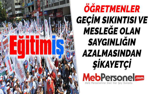 Eğitim-İş’in, 26 ilde 906 öğretmenle yüz yüze görüşerek yaptığı “Öğretmenlerin Ekonomik, Mesleki ve Sosyal Durumlarına İlişkin Öğretmen Görüşleri” adlı araştırma sonuçlarına göre öğretmenler en çok geçim sıkıntısından, mesleklerine olan saygınlığın azalmasından şikayetçi. Araştırmaya katılan öğretmenlerin yüzde 77’si öğretmenliğin saygın bir meslek olma özelliğini kaybettiğini belirtmektedir.