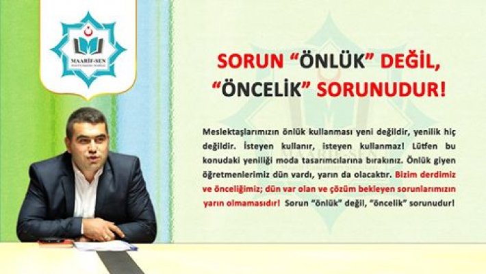 Meslektaşlarımızın önlük kullanması yeni değildir, yenilik hiç değildir. İsteyen kullanır, isteyen kullanmaz! Lütfen bu konudaki yeniliği moda tasarımcılarına bırakınız. Önlük giyen öğretmenlerimiz dün vardı, yarın da olacaktır. Bizim derdimiz ve önceliğimiz; dün var olan ve çözüm bekleyen sorunlarımızın yarın olmamasıdır! Sorun “önlük” değil, “öncelik” sorunudur!