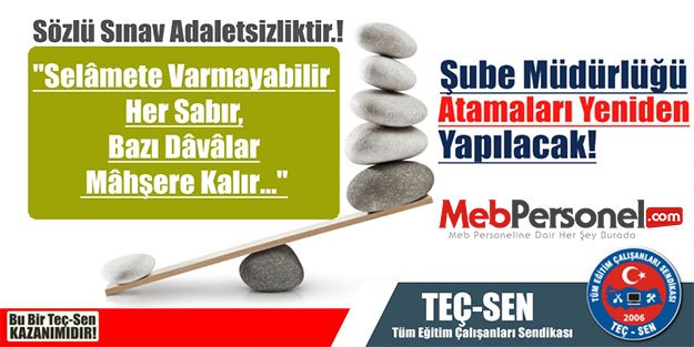 TEÇ-SEN Olarak, söz konusu Şube Müdürlüğü sınavından sonra yapılan “SÖZLÜ SINAV” ile ilgili Danıştay 5 Daire ve Danıştay 2.Daire olmak üzere açmış olduğumuz davalar ile Adalet aramıştık. Açtığımız tüm davaları kazanarak, sözlü sınava dayalı atamaların tümünün iptalini sağlamıştık.