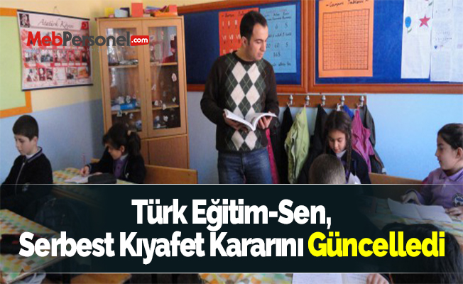 Türk Eğitim-Sen Merkez Yönetim Kurulumuzun …./…./2017 tarih ve …….. K. sayılı kararıyla, Kamu Kurum ve Kuruluşlarında Çalışan Personelin Kılık ve Kıyafetlerine Dair Yönetmeliğin 5. Maddesinde yer alan sınırlamalar ve çalışanları tek tipleştirme çabası kaldırılıncaya kadar genel ahlaki kurallara ve milletimizin değer yargılarına uygun bir biçimde kamuda çalışan üyelerimizin, “Serbest kılık-kıyafetle” iş yerlerine gitme kararının, 2017-2018 eğitim-öğretim yılı süresince, devam ettirilmesine karar verilmiştir.