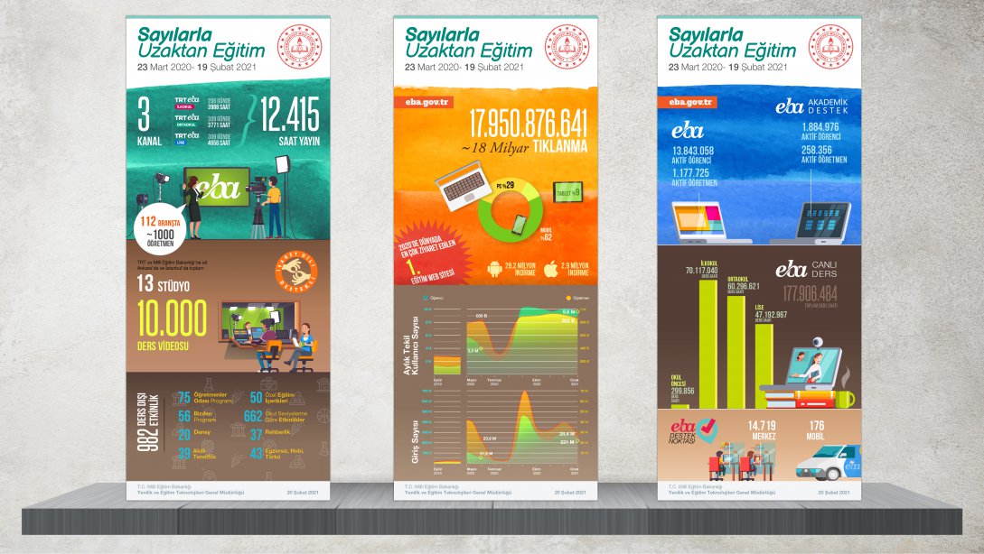 2020 – 2021 eğitim öğretim yılında 21 Eylül 2020 – 19 Şubat 2021 tarihleri arasında EBA TV İlkokul, EBA TV Ortaokul ve EBA TV Lise kanallarından toplam 6.220 saat yayın yapıldı ve bu yayınlar için Ankara ve İstanbul’da 13 ayrı stüdyoda çekimler gerçekleştirildi. 23 Mart 2020 – 19 Şubat 2021 tarihleri arasında yapılan toplam yayın saati 12.415 oldu. Uzaktan eğitim süresi boyunca toplam 10.000 ders videosu ve 982ders dışı etkinlik videosu hazırlandı.