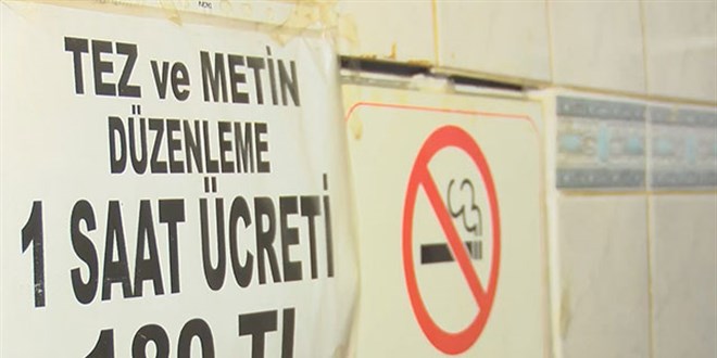 Akademik danışmanlık, bitirme projesi danışmanlığı, tez danışmanlığı adı altında başkalarının yerine tez yazan kişilerin sayısı gün geçtikçe artıyor. Yükseköğretim Kurulu (YÖK), para karşılığı tez ve ödev hazırlayan ve hazırlatan şüpheliler hakkında Ankara Cumhuriyet Başsavcılığına suç duyurusunda bulundu. Başkası yerine tez yazan ve yazdıranlar hakkında işlem başlatılacağı açıklanmasına rağmen internette ve üniversite etrafındaki kırtasiyelerden bu kişilere ulaşmak oldukça kolay. İnternet üzerinden ulaştığımız firmalarda fiyatlar sayfa başı 20 liradan başlıyor. Bazı firmalardaki kişiler, ise tez konusunu editörler araştırdıktan sonra söyleyebileceğini mail üzerinde fiyat verdiklerini belirtti.