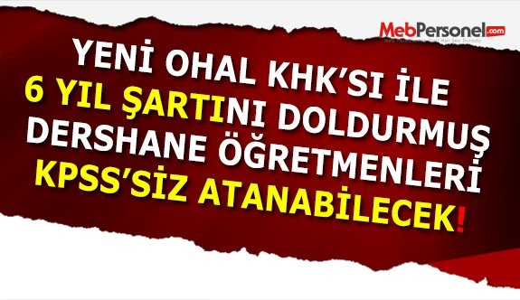 Milli Eğitim Bakanlığı(MEB), dershanelerin kapatılmasından sonra bu kurumlarda çalışan öğretmenler için geçtiğimiz yıllarda çalışma başlatmış fakat KPSS’siz atama yapılacağı için atama bekleyen öğretmenlerin ve kamuoyunun tepkisi sebebi ile bu girişim rafa kaldırılmıştı. Bir kaç yıl önce MEB’in gerçekleştirmeye çalıştığı atamalar OHAL KHK’sı ile önümüzdeki öğretmen atamalarında gerçekleştirilecek. Yeni KHK’ya göre dershane öğretmenleri, 6 yıl çalıştılarsa MEB’e KPSS’siz olarak atanabilecekler.
