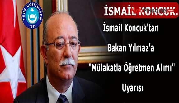 İsmail Koncuk’tan Bakan Yılmaz’a “Mülakatla Öğretmen Alımı” Uyarısı. Türk Eğitim Sen Genel Başkanı İsmail Koncuk, Bakan İsmet Yılmaz’a sözleşmeli öğretmenlik ve mülakatla öğretmen alımı üzerinden eleştirilerde bulundu. Koncuk, mülakatla öğretmen alımı yapılmasının atama bekleyen ve KPSS’ye giren öğretmen adayları için haksızlık olacağını bu uygulama düşüncesinden vazgeçilmesi gerektiğini tweetlerinde belirtti.