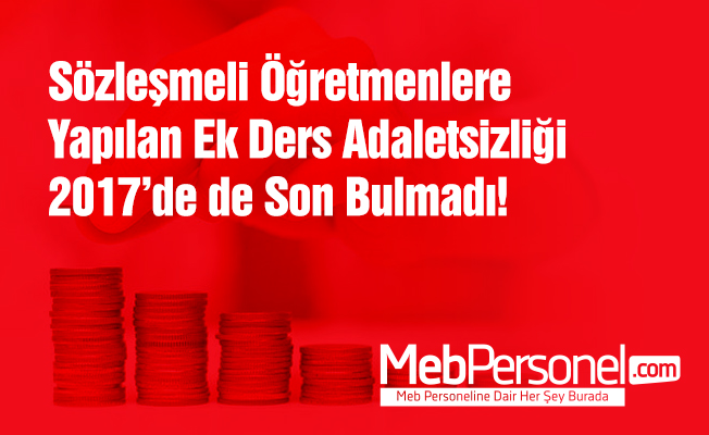 Sözleşmeli öğretmenlerin ek ders ücretleri, kadrolu öğretmenlere göre 2016 yılında daha az ödeniyordu. MEB’in bu sorunu 2017 yılında çözeceği tahmin ediliyordu fakat sözleşmeli öğretmenlere ödenen ek ders ücreti hala eksik.