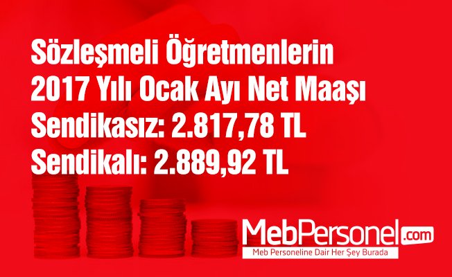 Sözleşmeli öğretmenler 2017 yılı Ocak ayında 14 günlük maaş farkı ile birlikte 2.817,78 TL alacak. Sendika üyesi öğretmenlerin alacağı 2017 Ocak ayı net maaş ise toplu sözleşme ikramiyesi ile birlikte 2.889,92 TL olacak.