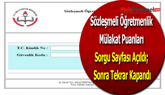 Mebpersonel.com – MEB tarafından sözleşmeli öğretmenlik mülakat puanları sorgu sayfası bir süre önce erişime açıldı. Birkaç dakika açık kalan sorgu sayfası tekrar erişime kapatıldı.