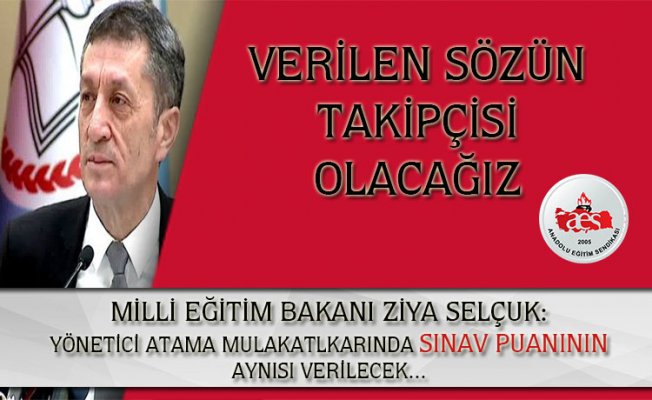Milli Eğitim Bakanı sayın Ziya SELÇUK , Ankara’da Şehit Ömer HALİSDEMİR İmam Hatip Lisesinde öğretmenlere hitap ederken yönetici atamaları konusunda yaptığı açıklamada; ”Yönetici atamalarıyla ilgili sınav yapacağız, adamı olan değil, işin ehli olanı atayacağız; güvenlikte sıkıntı yoksa yönetici atama mülakatlarında herkese sınav puanının aynısını vereceğiz” dedi